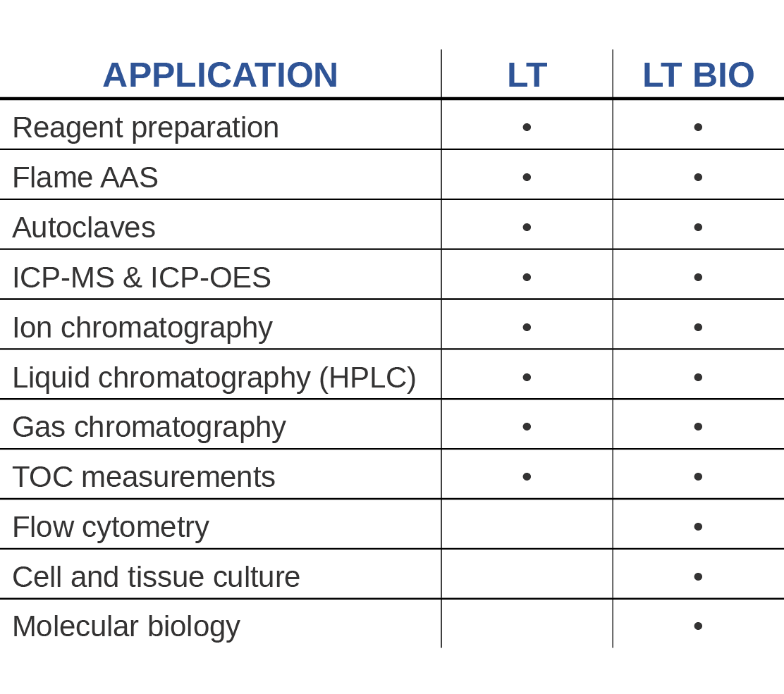 | Grade 1 water conductivity at 25 °C | 0.055 μS/cm | 0.055 μS/cm |