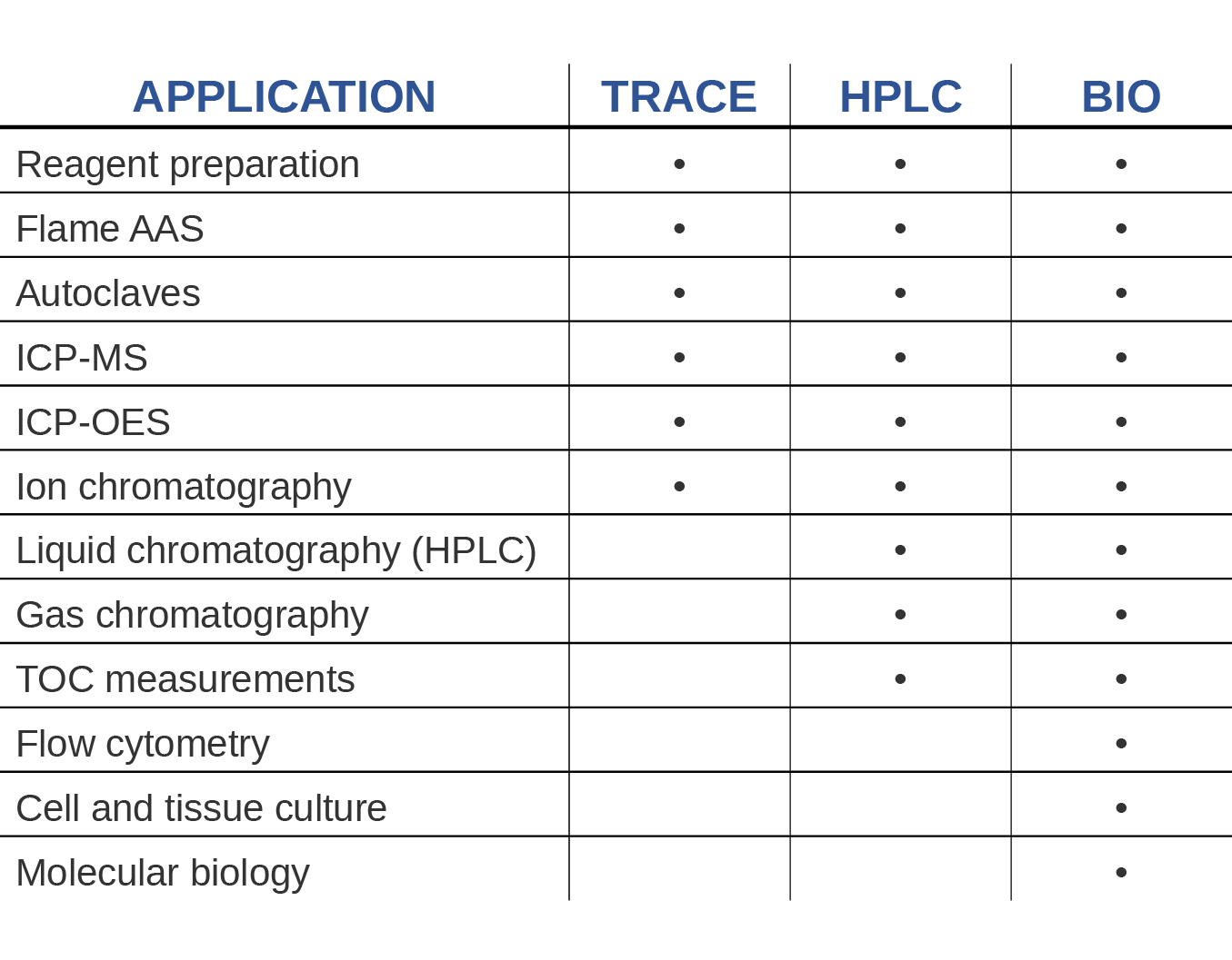 | Grade 1 water conductivity at 25 °C | 0.055 μS/cm | 0.055 μS/cm | 0.055 μS/cm |